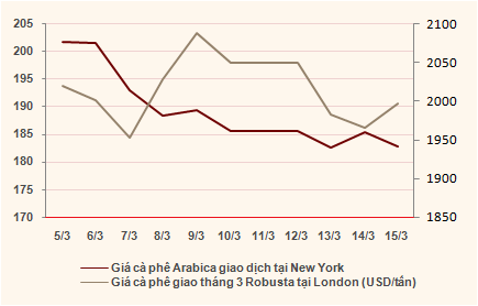 Tại New York, giá cà phê arabica giao tháng 3 giảm 2,6 cent/pound tương đương 1,42%, xuống 182,75 cent/pound trong khi giá giao tháng 5 tăng 3,25 cent/pound trương đương 0,16% lên 185,15 cent/pound.