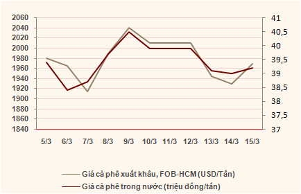 Giá cà phê xuất khẩu loại 5% đen vỡ giao tại cảng TPHCM có giá 1.970 USD/tấn, FOB, mức trừ lùi 30 USD/tấn.