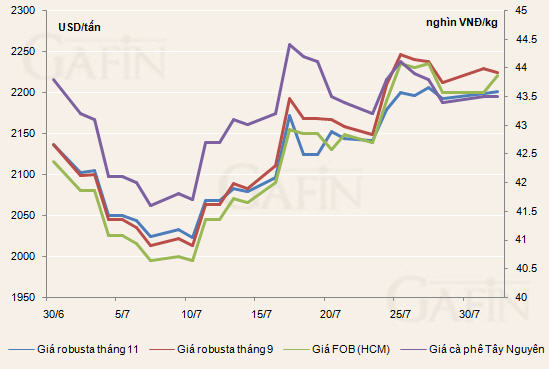 Trên sàn Liffe (London) giá cà phê robusta các kỳ hạn biến động trái chiều. Hợp đồng giao tháng 9 giảm 5 USD xuống còn 2.224 USD/tấn, hợp đồng giao tháng 11 tăng nhẹ 2 USD, lên 2.201 USD/tấn.