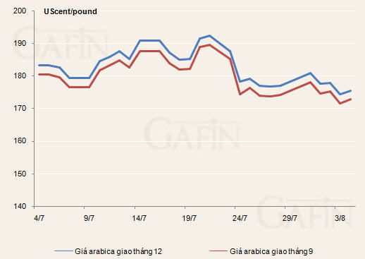 Trên sàn ICE New York, giá cà phê arabica các kỳ hạn đồng loạt tăng nhẹ so với phiên trước đó. Hợp đồng giao tháng 9 tăng 1,15 cent, tương đương 0,7%, lên 172,8 cent/pound. Hợp đồng giao tháng 12 tăng 1,25 cent, lên 175,55 cent/pound.