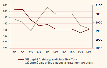 Kết thúc phiên giao dịch hôm qua, giá cà phê robusta giao tháng 3 trên sàn London giữ ở mức 1.982 USD/tấn, giảm 17 USD/tấn tương đương 0,87% so với phiên trước đó. Giá cà phê loại này giao tháng 5 giảm 14 USD/tấn.