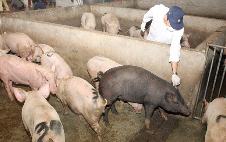 Cán bộ thú y kiểm tra lâm sàng đàn lợn sống trước khi đưa vào giết mổ
