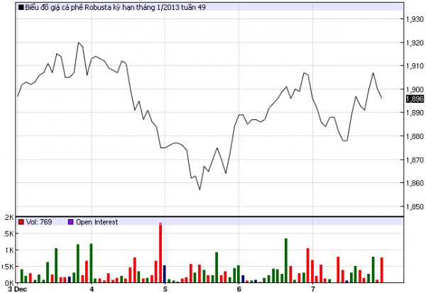 Cuối tuần, giá cà phê Robusta London chốt tuần bằng một phiên sụt giảm. Kỳ hạn giao tháng 1/2013 giảm 9 USD, tương đương 0,47%, xuống 1.896 USD/tấn và kỳ hạn giao tháng 3/2013 giảm 7 USD, tương đương 0,37%, còn 1.904 USD/tấn, các mức giảm khá nhẹ.